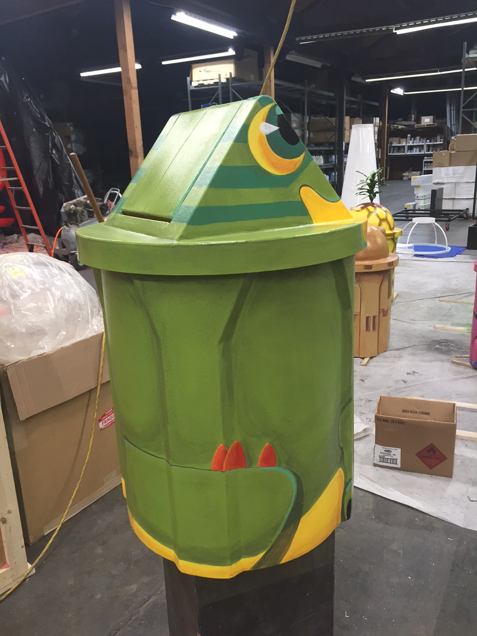 scenic design – trash can painting – snapchat – angie lister (4) August 10, 2017 Trash can painting for Snapchat 960 × 1280 Dinosaur trash can by Angie Lister Dinosaur trash can, scenic design work by Angie Lister for Snapchat